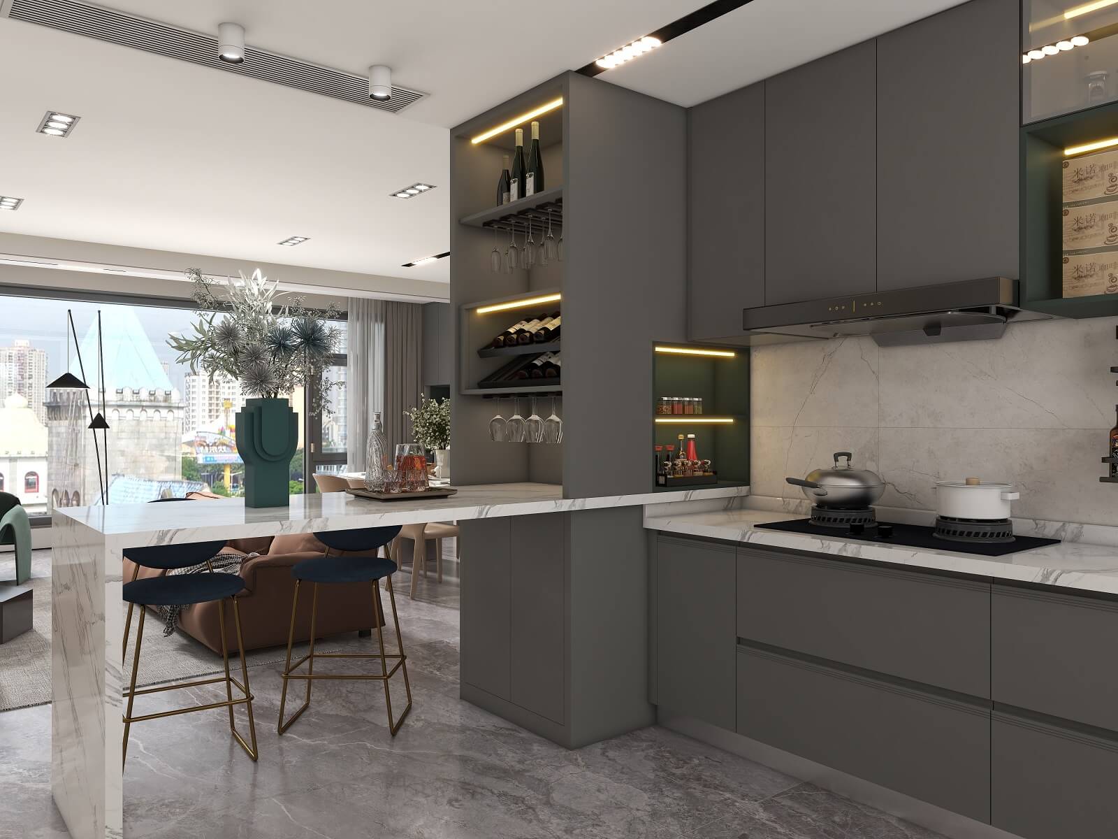 光影流动,木饰面、大理石、木格栅交织出不同层次秩序,给予空间精致质感。